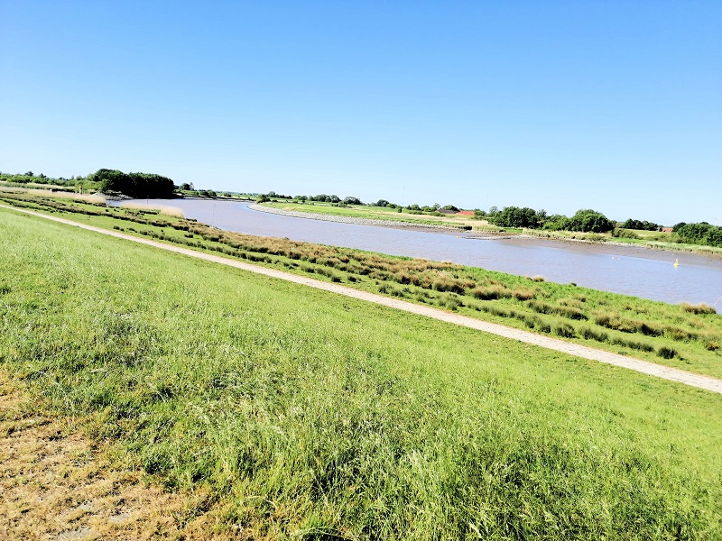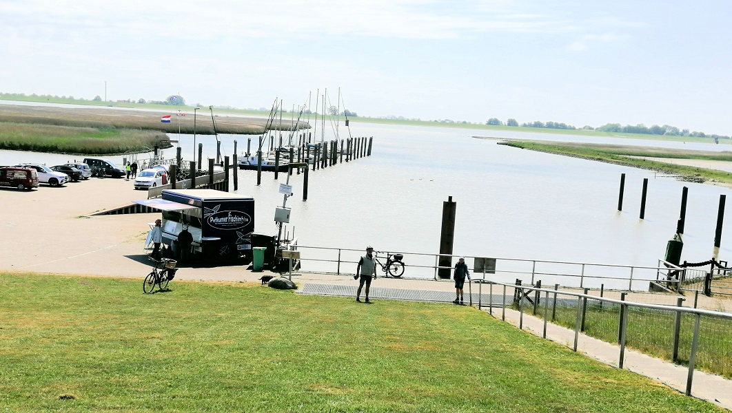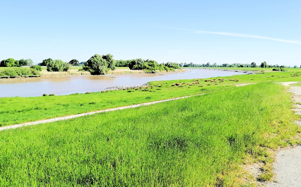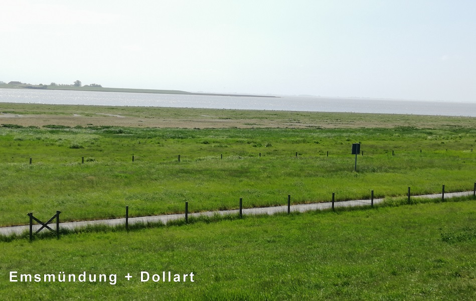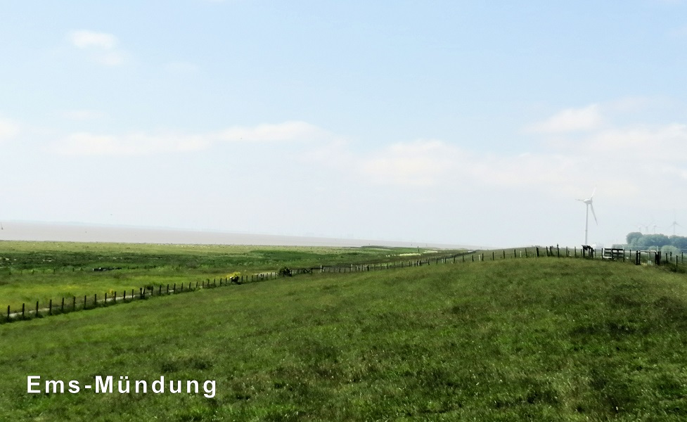 den Deich, wenn möglich, hoch. Was sieht man ?, die neue Ems mit