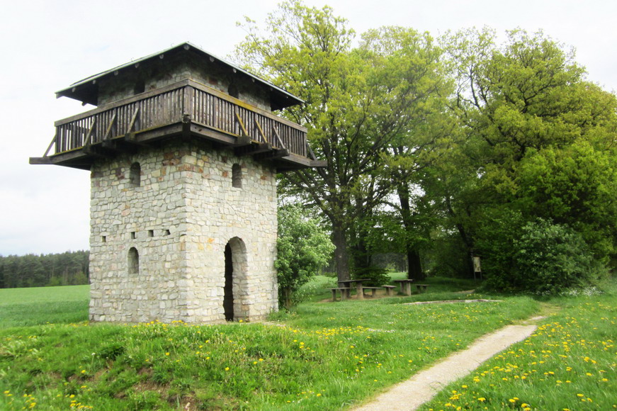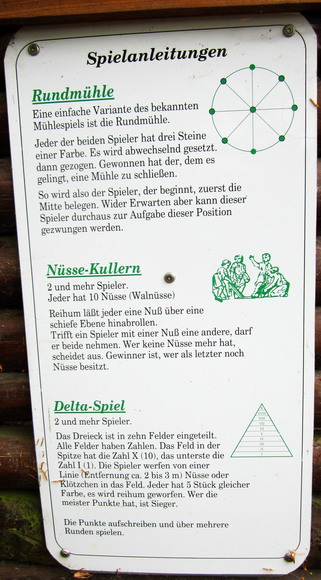 Wald, Felder, gemähte Graswege, beschildert mit Km-Angaben, Schutzhütten und
