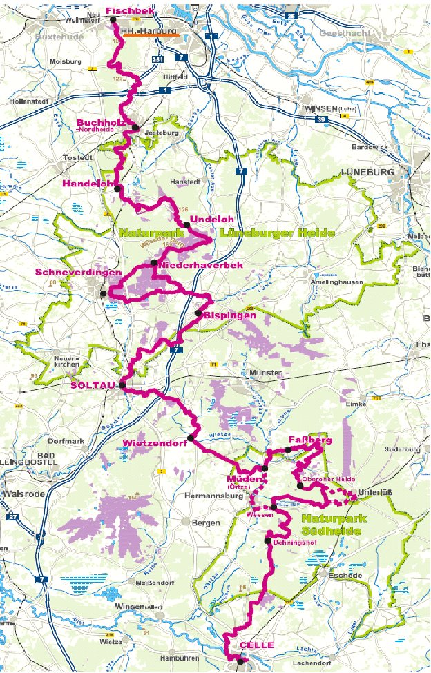Ein bisschen Heide, viel Wald, öfters längs dem Bach "Örtze" und viel Leute