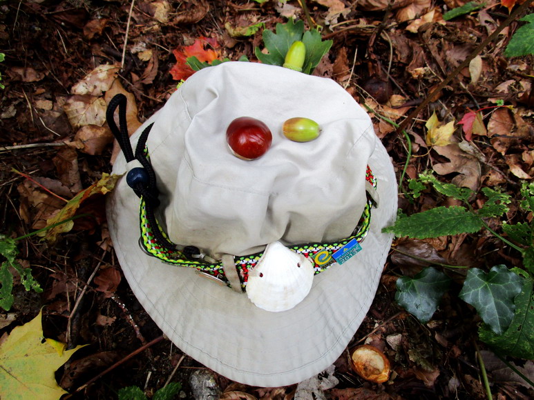 hängen voller Wassertröpfchen. Einmal eine Kastanie und einmal eine Eichel sind