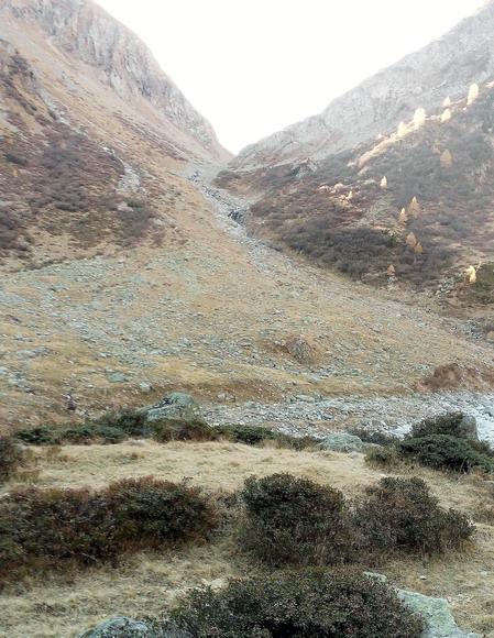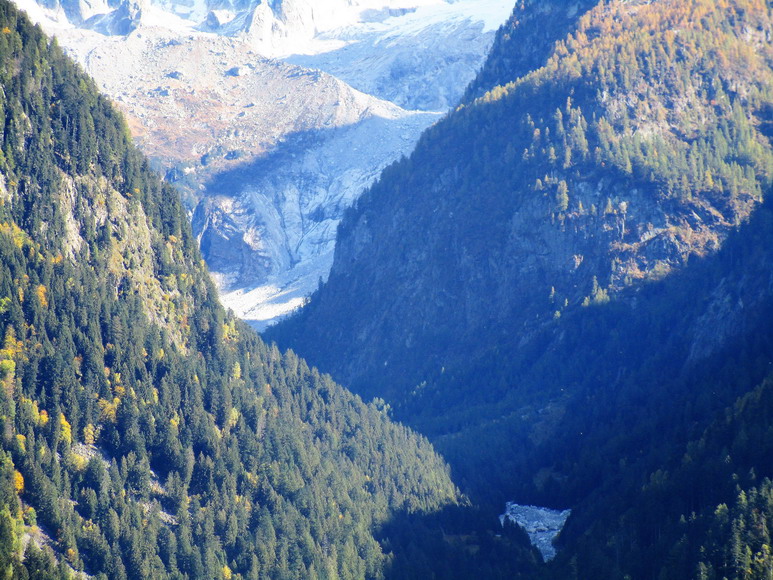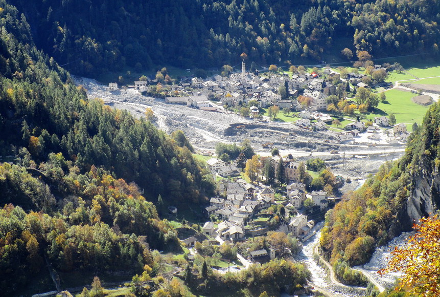 Von hier oben sehen wir in das vom Bergsturz verwüsteten Ort "Bondo" und die