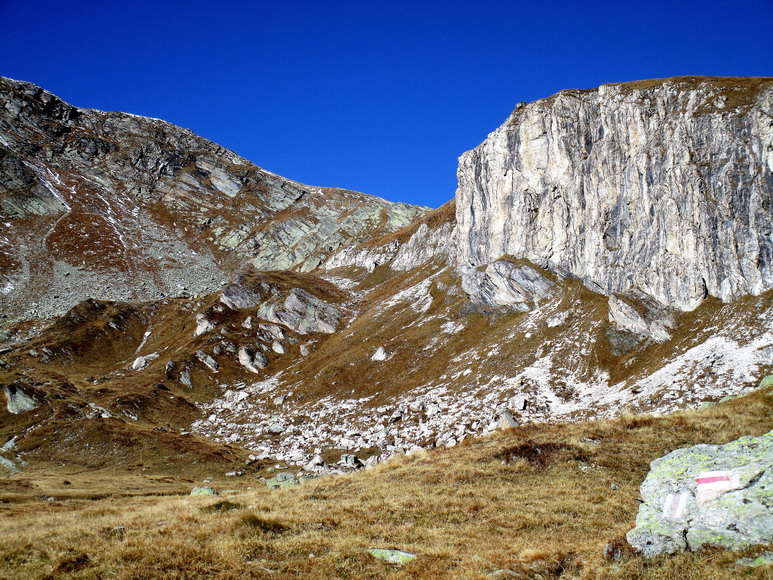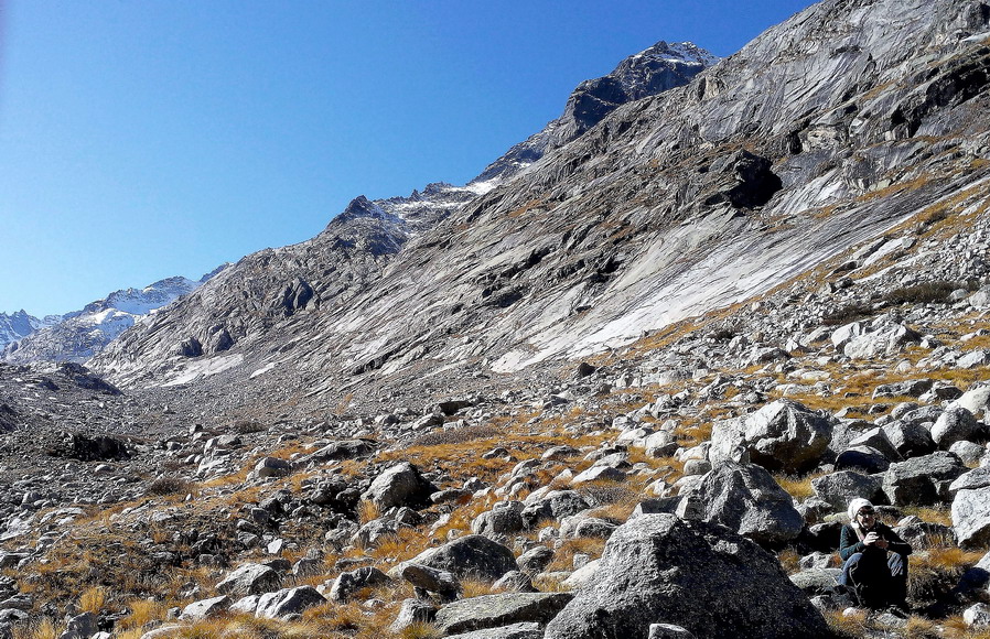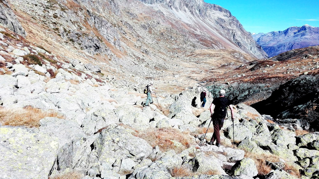 Geröllhänge des "Piz Grevasalvas". Queren die Hochalm des "Muotta Radonda"