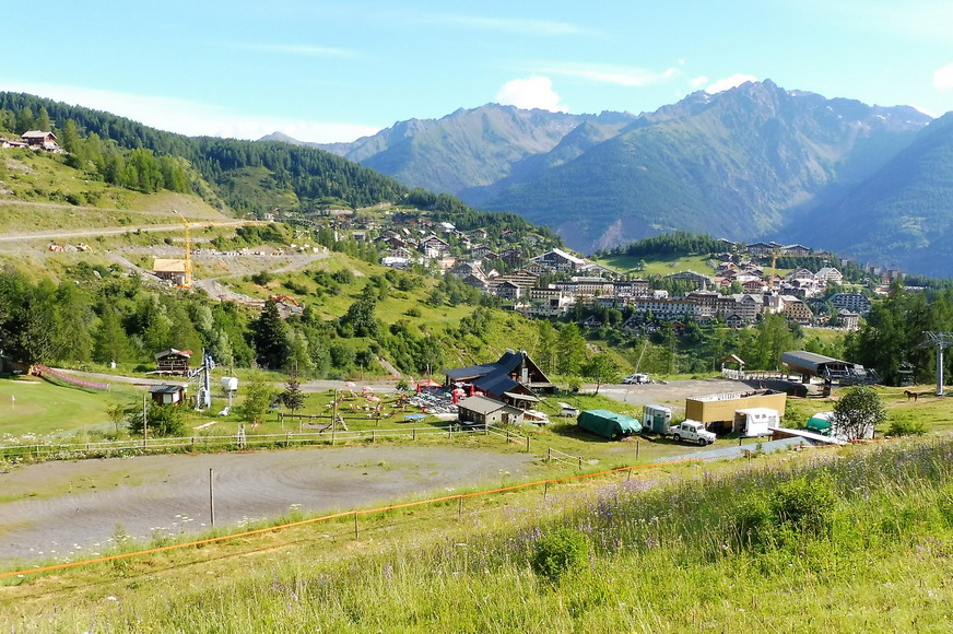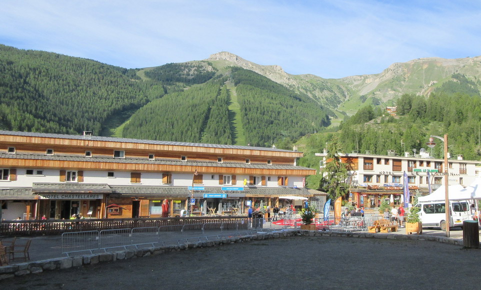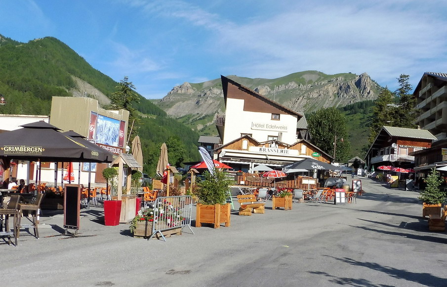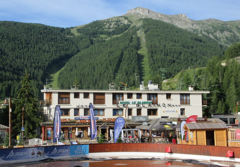 "Auron 1600m.", einem Skiort hoch in den Bergen bei heißem Wetter.